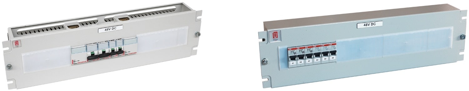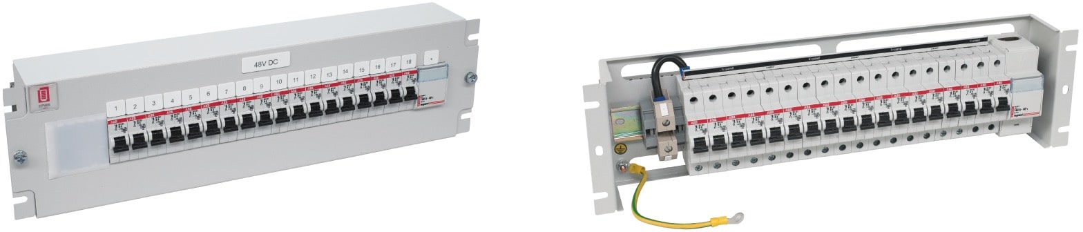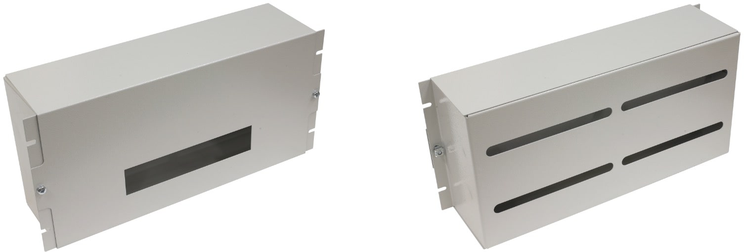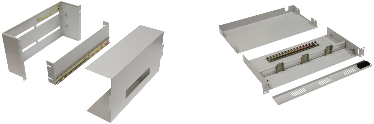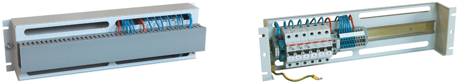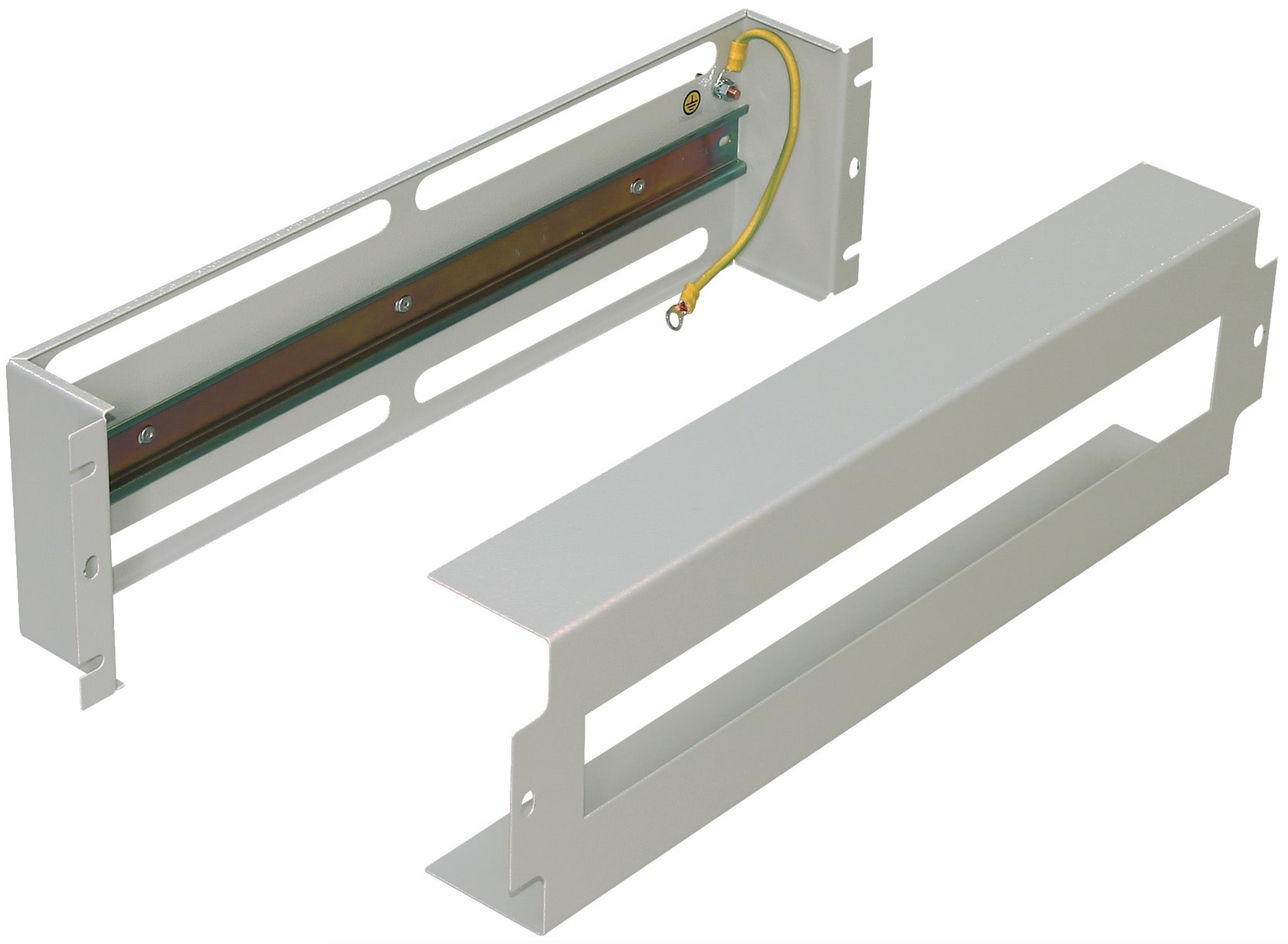 Universelles 3 HE 19"-Panel für 35 mm Elektrobauteile. Standardmäßig ausgestattet mit 35 mm DIN-Schiene und Abdeckung mit 402,5 x 45,5 mm Öffnung.